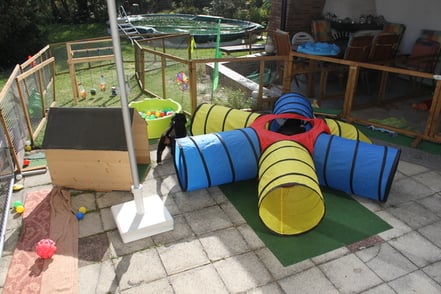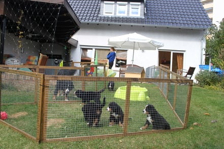 Etwa ab der 4. Woche, je nach Wetterlage, können sich unsere Welpen zunächst in einem geschützten Auslauf, später dann unter Aufsicht im Garten austoben. Dabei treffen sie auf viele verschiedene Kennenlern-, Erkundungs- und Spielmöglichkeiten im abwechslungsreichen Welpenauslauf mit natürlichen Materialien sowie verschiedenem Spielzeug.